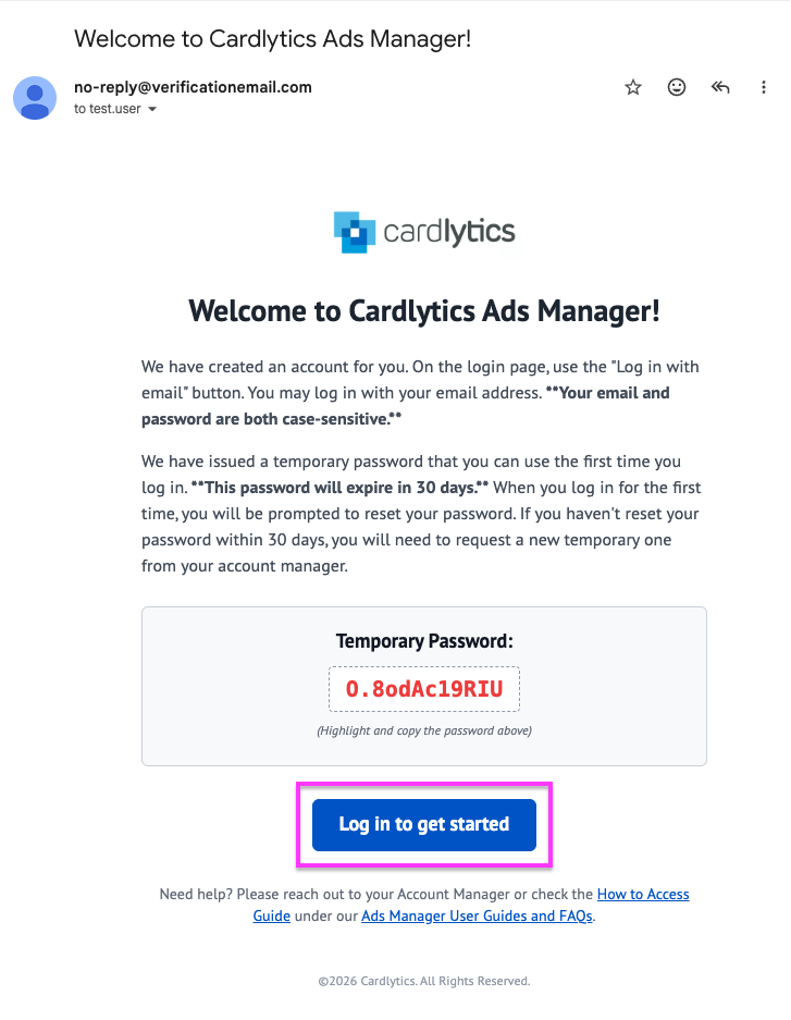 Once you receive the invite email, click the button at the bottom: Log in to get started, or go directly to Ads Manager: ads.cardlytics.com to log in.