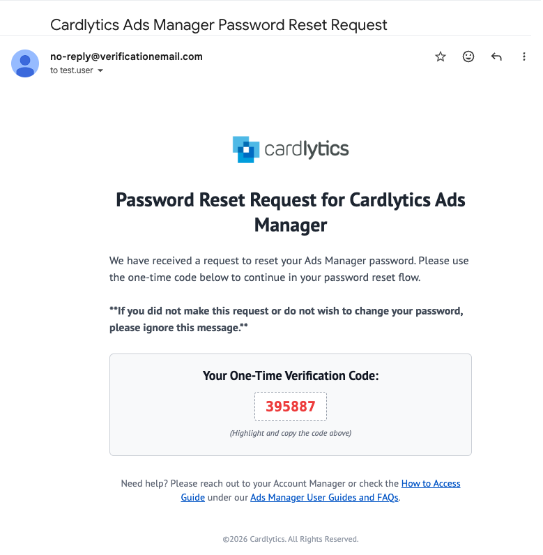 [[email protected]]with subject Cardlytics Ads Manager Password Reset Request. Please check your spam folder for any emails from this address.